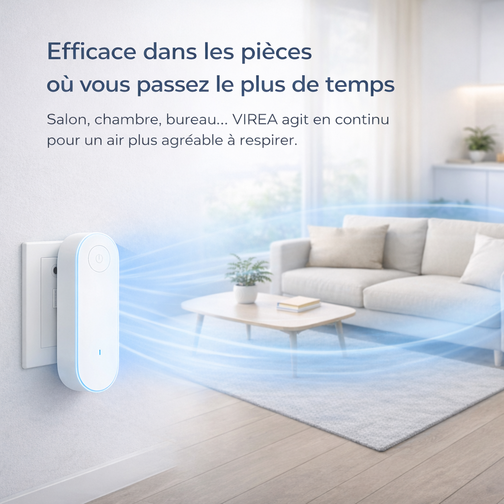 VIREA agit en continu sur l’air ambiant, contribuant à le rendre plus léger et plus agréable, sans parfum, sans produit chimique et sans entretien.